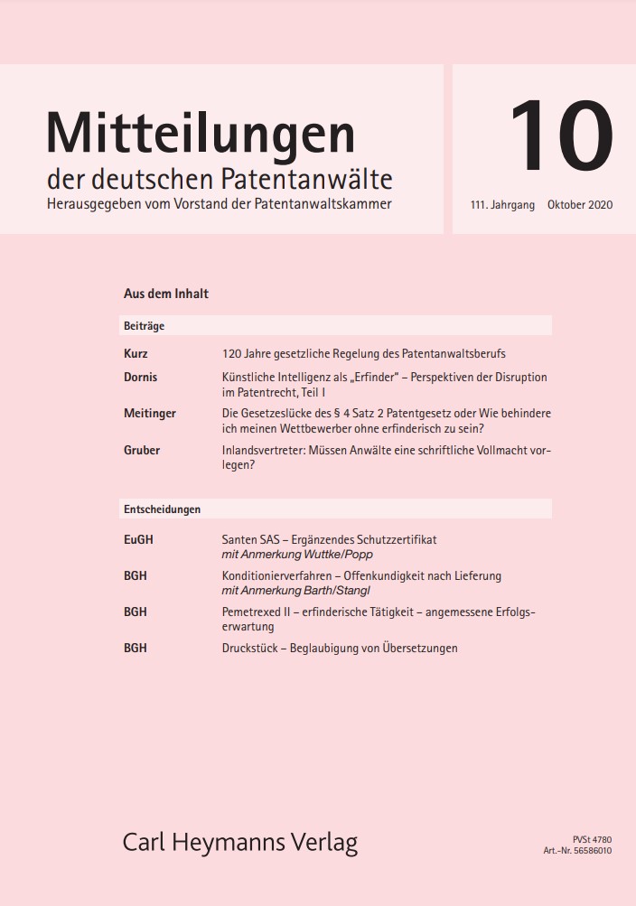 Dr. Meitinger beschreibt in der Februar-Ausgabe des Jahres 2020 die Konsequenzen des Auftretens der Künstlichen Intelligenz für das Patentrecht